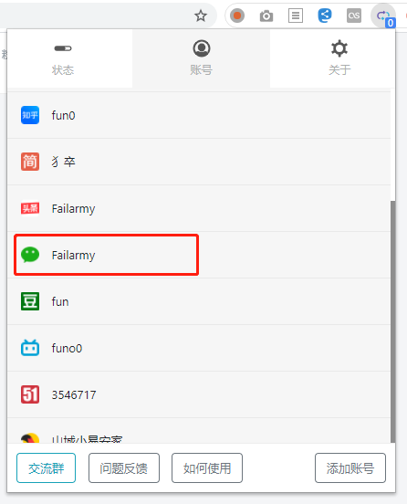 下载文章同步助手 谷歌浏览器插件,登录微信公众号后即可识别到你的账号