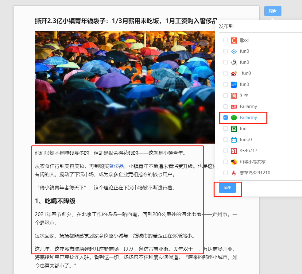 右边以删减不需要的内容,点击同步选择要同步到的公众号。